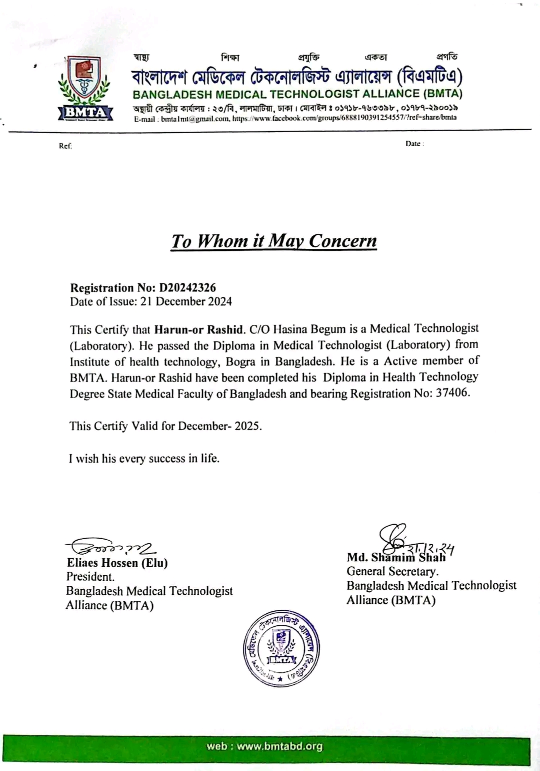 পরবর্তীতে তিনি বিএমটিএ সহযোগীতায় দুবাই হেলর্থ অর্থরিটি পরীক্ষা দিয়ে রেজিস্ট্রেশন পেয়ে এখন মেডিকেল টেকনোলোজিস্ট হিসেবে দুবাই চাকরি পেয়েছেন।