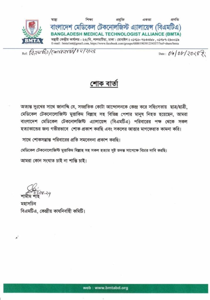 মেডিকেল টেকনোলজিস্ট মুত্তাকিন বিল্লাহ হত্যাকান্ডের সাথে জড়িতদের দৃষ্টান্তমূলক শাস্তি দাবী জানিয়েছে BMTA