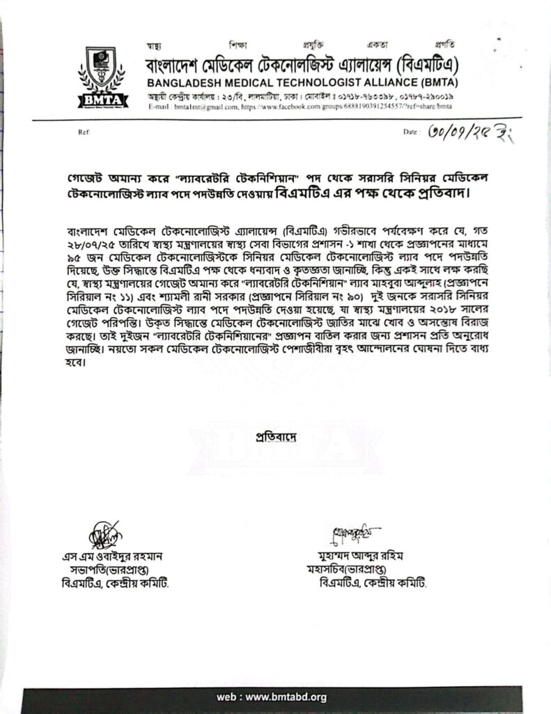টেকনিশিয়ানকে সিনিয়র মেডিকেল টেকনোলজিস্ট পদোন্নতি দেওয়ায় বিএমটিএ পক্ষ থেকে প্রতিবাদ