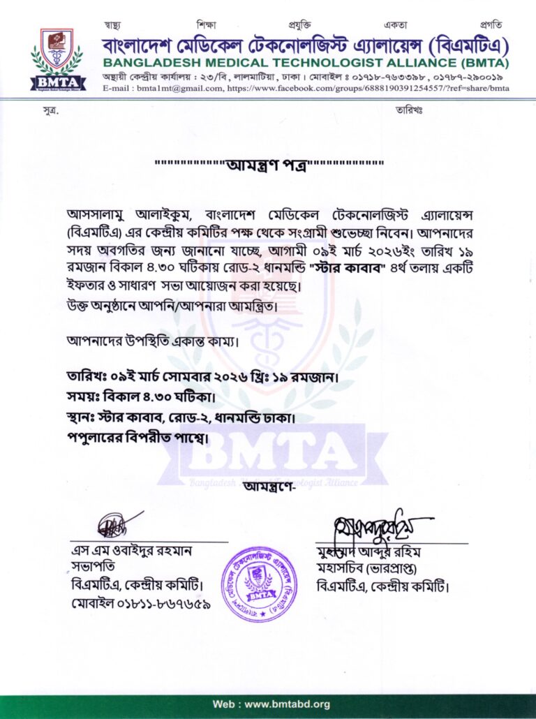 “”””””””””আমন্ত্রণ পত্র”””””””””””” আসসালামু আলাইকুম, বাংলাদেশ মেডিকেল টেকনোলজিস্ট এ্যালায়েন্স (বিএমটিএ) কেন্দ্রীয় কমিটির পক্ষ থেকে সংগ্রামী শুভেচ্ছা নিবেন। আপনাদের সদয় অবগতির জন্য জানানো যাচ্ছে, আগামী ০৯ই মার্চ