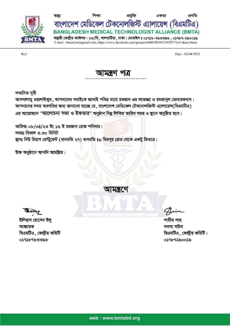 Bangladesh medical Technologist Alliance (বাংলাদেশ মেডিকেল টেকনোলজিস্ট এ্যালায়েন্স), বিএমটিএ কর্তৃক আয়োজিত ইফতার মাহফিলে বাংলাদেশের সকল প্রান্তের সকল মেডিকেল টেকনোলজিস্ট কে আমন্ত্রণ জানানো হলো! উক্ত অনুষ্ঠানে